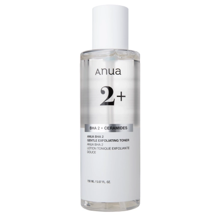 Anua - BHA 2% Gentle Exfoliating Toner - ein peelendes Gesichtswasser mit 2% Salicylsäure in einer milden Formel. Es reinigt verstopfte Poren, reduziert Mitesser und glättet die Epidermis. Seine Zusammensetzung ist mit lindernden und regenerierenden Inhaltsstoffen angereichert, wodurch das Produkt sanft zur Haut ist und auch bei zu Irritationen neigender Haut verwendet werden kann. Das Tonic enthält Ceramide, die sich um den Zustand der Hydrolipidbarriere kümmern, sowie Panthenol und Hyaluronsäure, die Feuchtigkeit spenden und vor Trockenheit schützen. Der verwendete Teebaumextrakt wirkt entzündungshemmend und reduziert die Bildung von Unreinheiten. Das Kosmetikum enthält keine Duftstoffe.