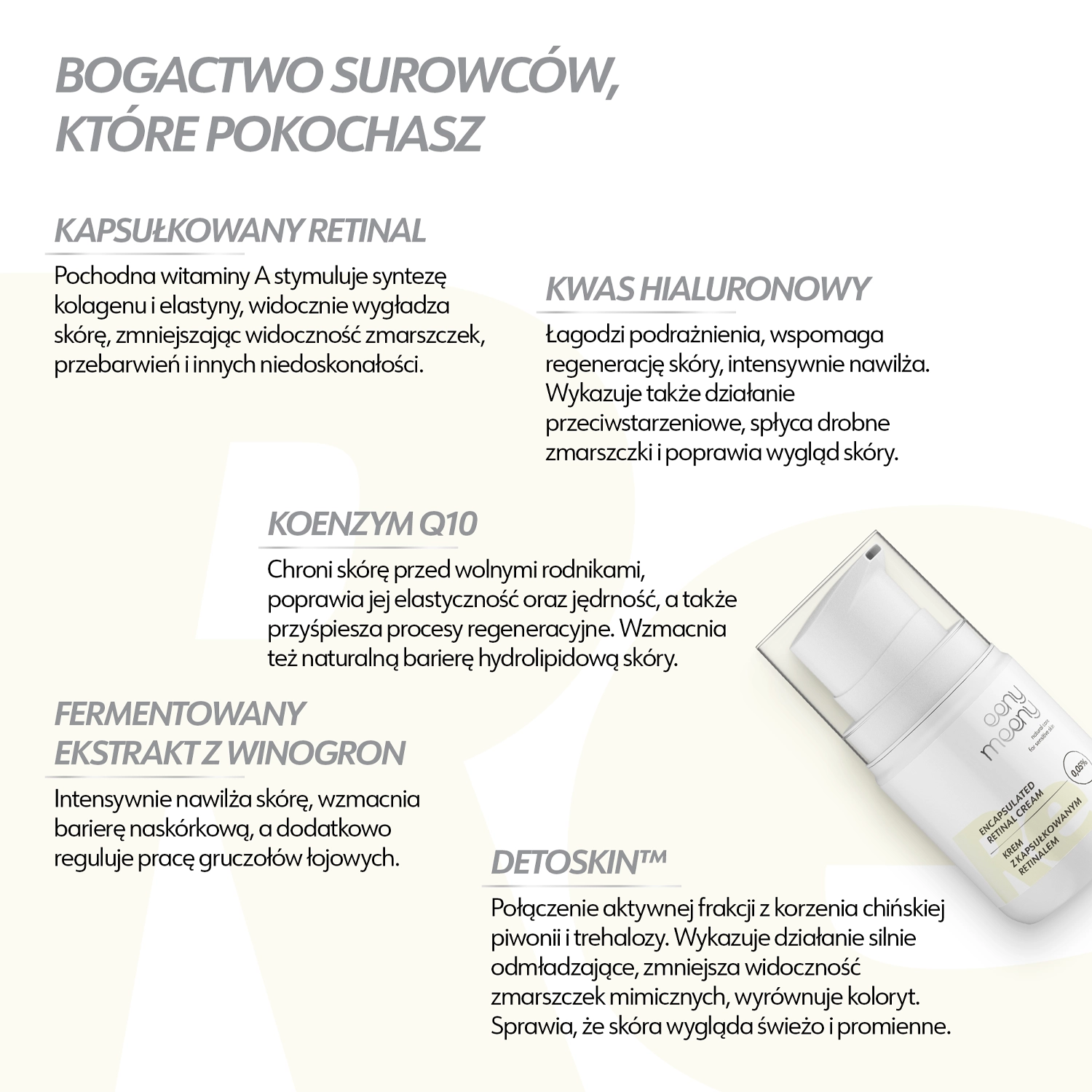 - Retinal - hat eine Anti-Aging- und Anti-Akne-Wirkung, hellt Verfärbungen auf, strafft und glättet,