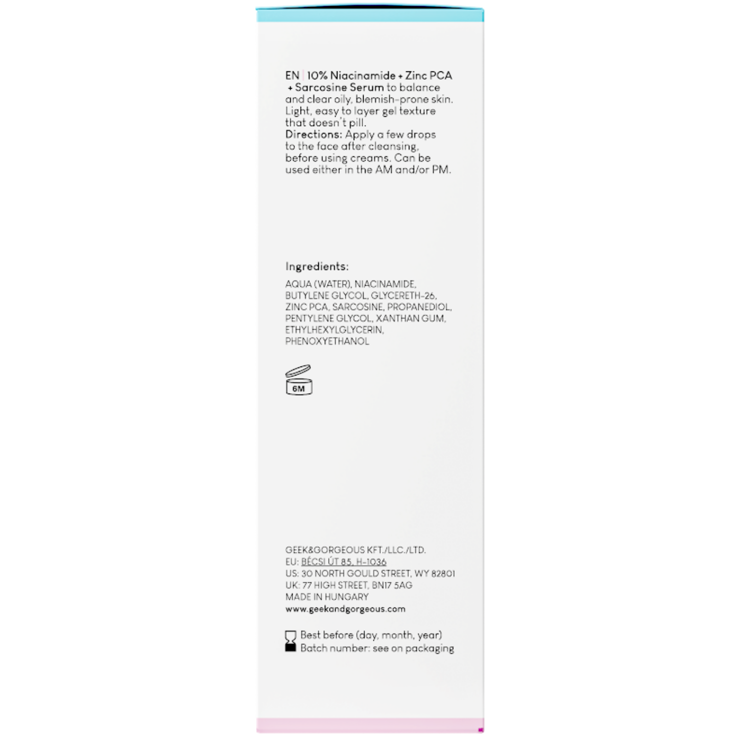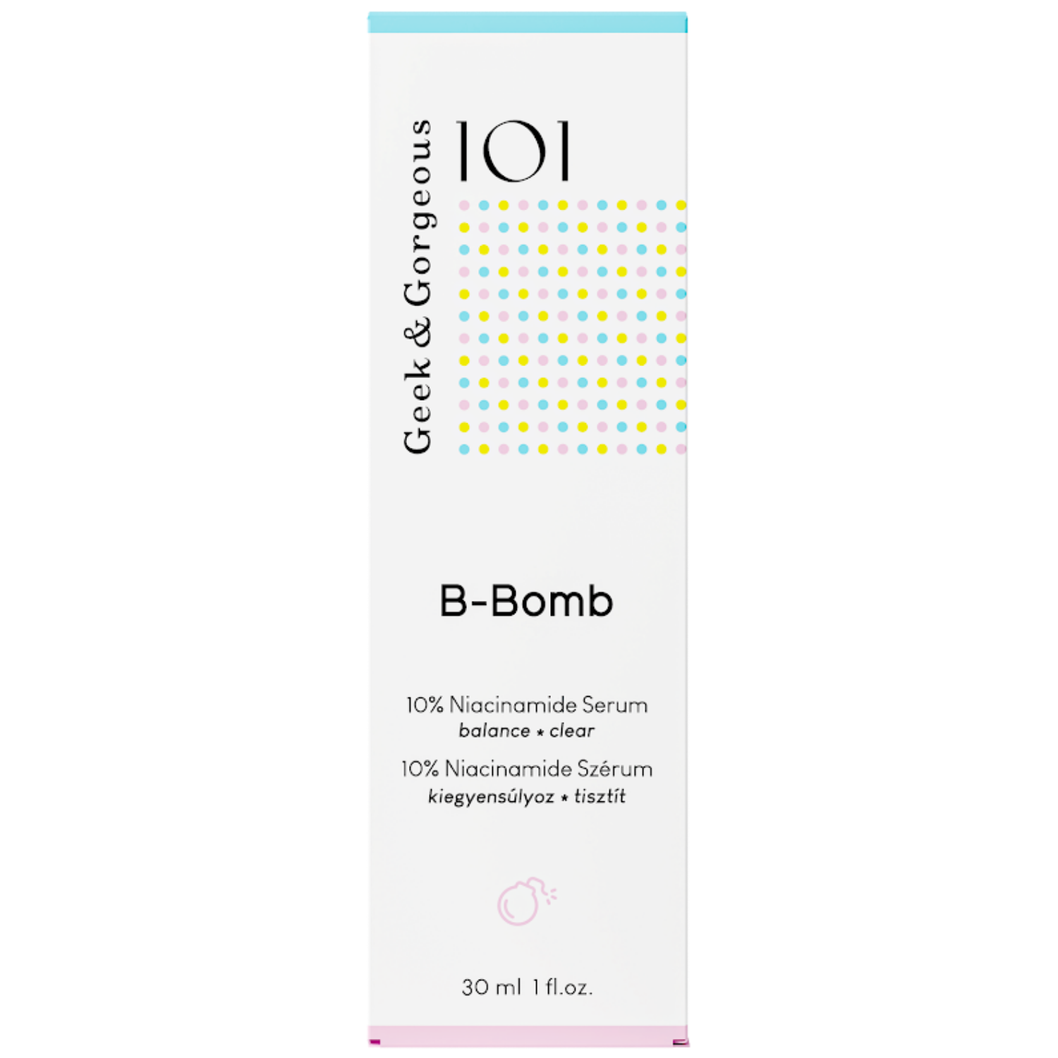 Geek & Gorgeous - B-Bomb - enthält Niacinamid, das eine normalisierende, entzündungshemmende, antiradikale, stärkende und aufhellende Wirkung hat. Darüber hinaus hat PCA-Zink antibakterielle, feuchtigkeitsspendende und regenerierende Eigenschaften, und Sarkosin reduziert die Sichtbarkeit die Ausgängen von Talgdrüsen und reguliert ihre Arbeit. Das Serum hat eine Gelkonsistenz und trocknet die Haut oder bleibt keines Spannungsgefühl. Es hat einen pH-Wert von 5,5-6,5.