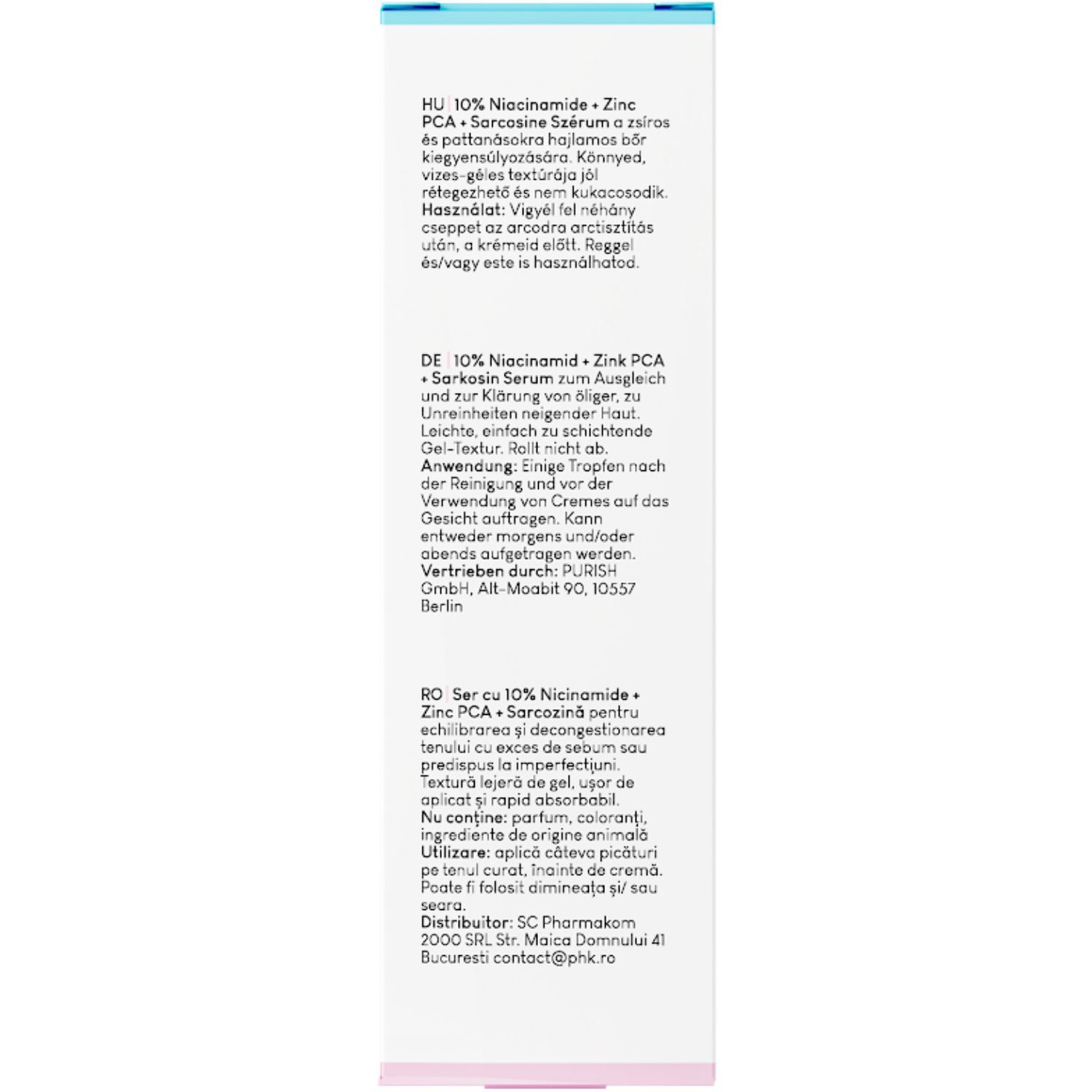 - PCA-Zink - hat antibakterielle, normalisierende und feuchtigkeitsspendende Eigenschaften, unterstützt die Heilung von Entzündungen,