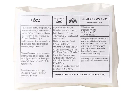 Ministerstwo Dobrego Mydła - Halbkugel zum Bad mit französischem Ton - Halbkugel mit einem blumigen Rosenduft. Die Halbkugel zum Bad enthält unter anderem Sheabutter, die die Haut stark nährt und regeneriert. Süßmandelöl, Reisöl und Traubenkernöl verhindern den Wasserverlust der Epidermis und schmieren die Haut, Milch wirkt beruhigend und rosa französische Tonerde entfernt abgestorbene Hautschüppchen und reinigt. Nach dem Bad wird die Haut genährt, mit Feuchtigkeit versorgt und glatt und benötigt keine Lotion.